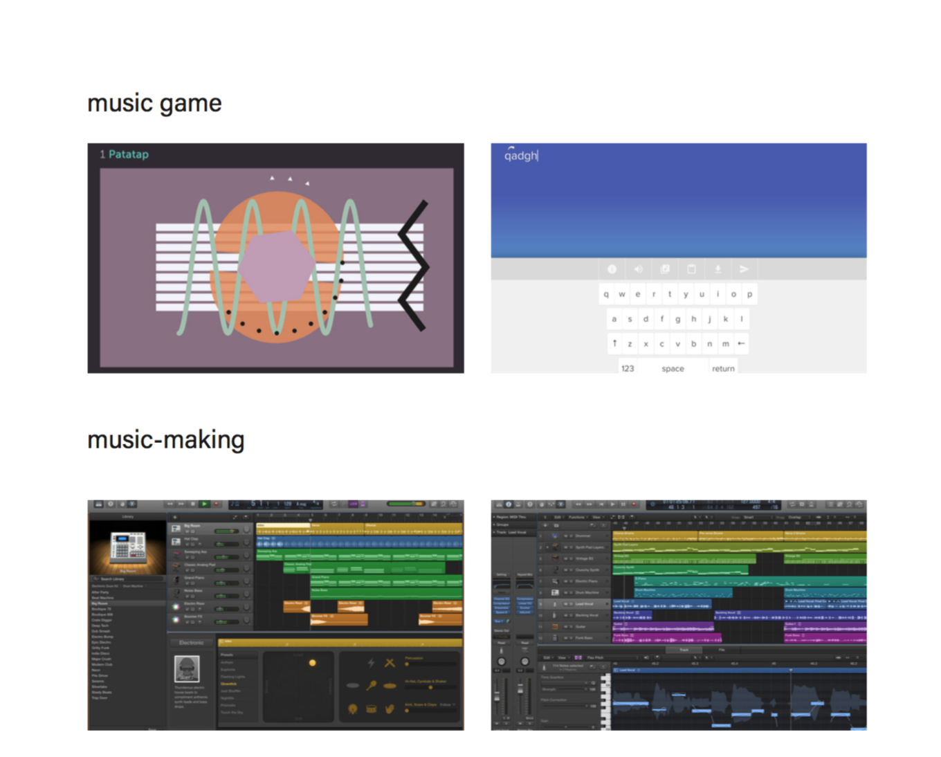 I found that people like playing music games like Guitar Hero or Patatap. However, these games don’t help users learn how to create music - instead, they only provide fun and entertainment. Other than this, the music production software that I researched, such as Digital Audio Workstation, was not easy to use.