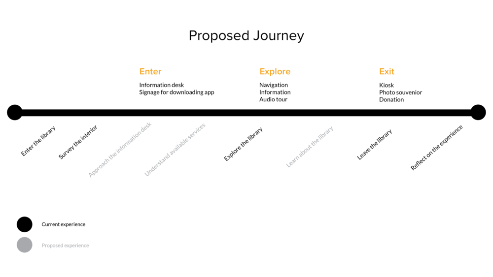 We decided to first tackle the most significant problems around way finding and accessibility. We thought of many ways to solve for it with signage, but we wanted to preserve the architecture and physical space of the library as best as possible. And we found the app to be the most discreet, yet useful solution. The app would also solve the problem of not having enough devices or multiple language devices.